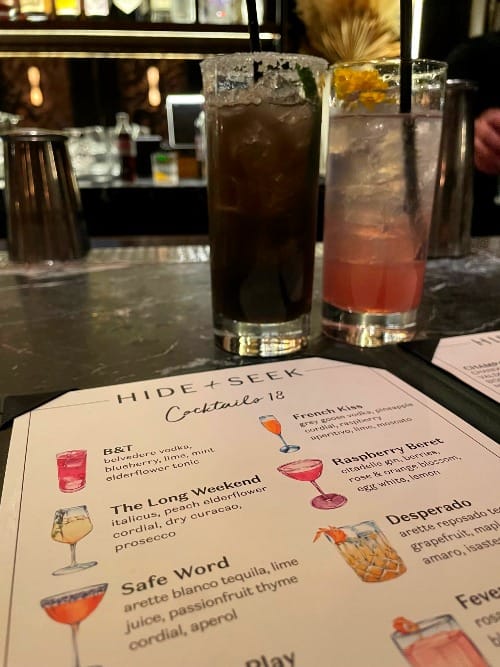 1) Hide + Seek~ An elegant and rustic bar with a cozy atmosphere. Fun chandeliers with floor to ceiling windows that look out onto a very lively Randolph Street. The drinks we ordered from here were: Shadow Play (a smoky drink!) and B&T . The menu offers a handful of creative cocktails to satisfy almost everyone's calling. We also ordered a side of deliciously seasoned fries and dip. A great spot to hit up on the weekends!